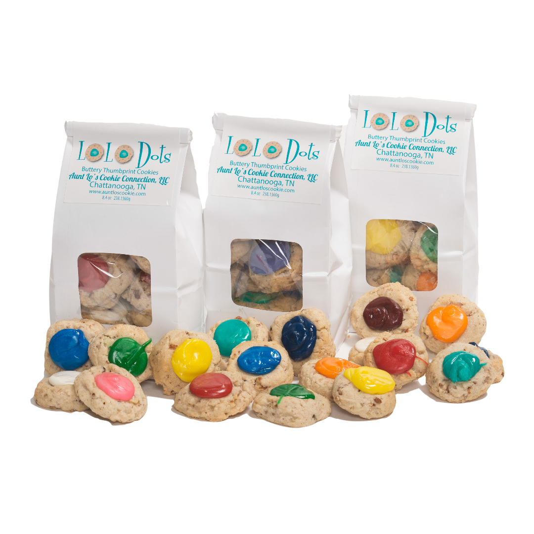 “Aunt Lo’s Cookie Connection came into being when I was looking for a way to contribute to my family and still be able to be available to my children. I have always made LoLo Dots. As a small child I made them with my mother every Christmas. As an adult I started making LoLo Dots for my family and neighbors for Christmas. People really enjoyed them and started asking for them at other times. I had a friend with a bakery and she started selling them. They went over so well I decided to make them available in local gift shops.”