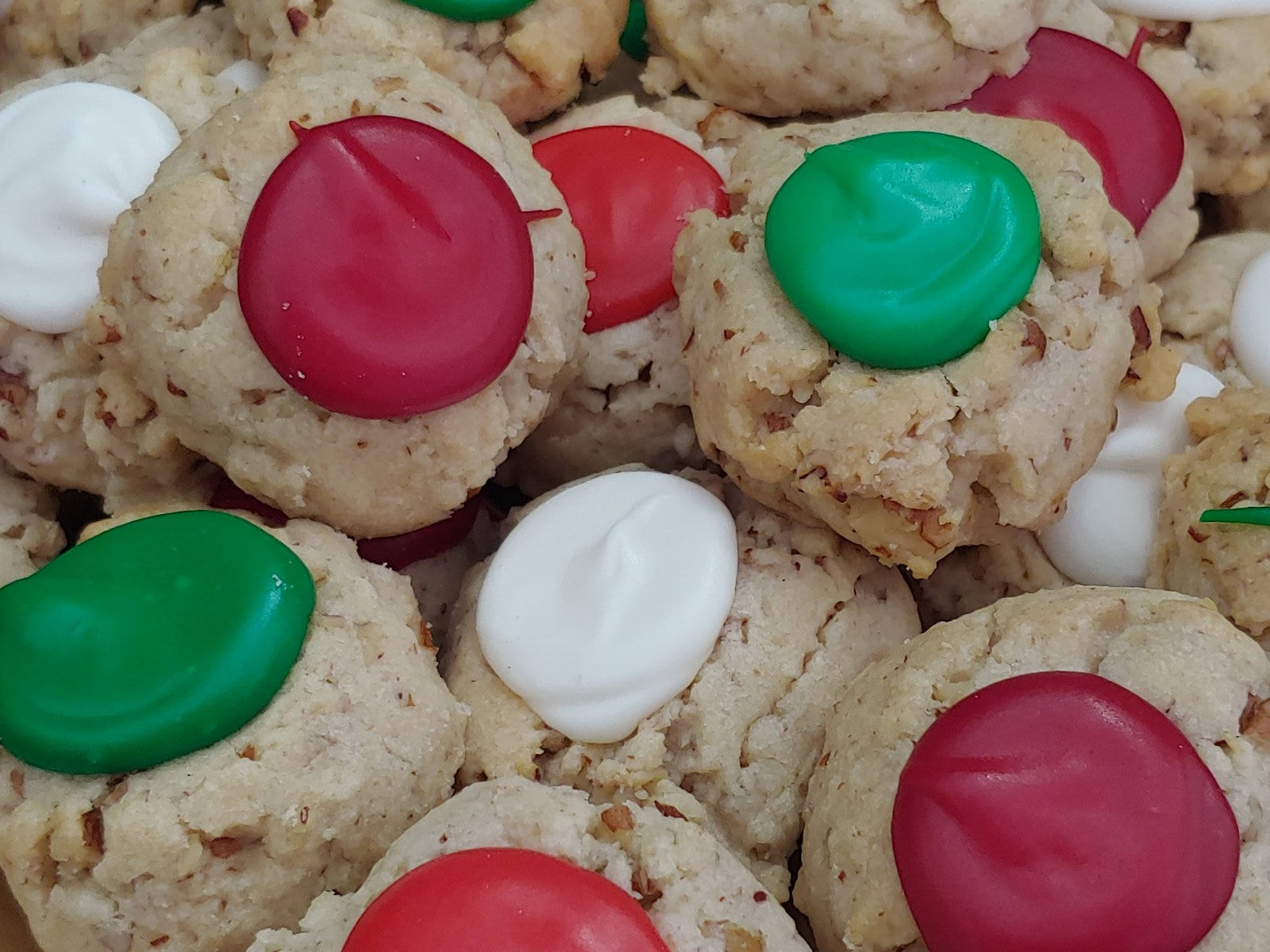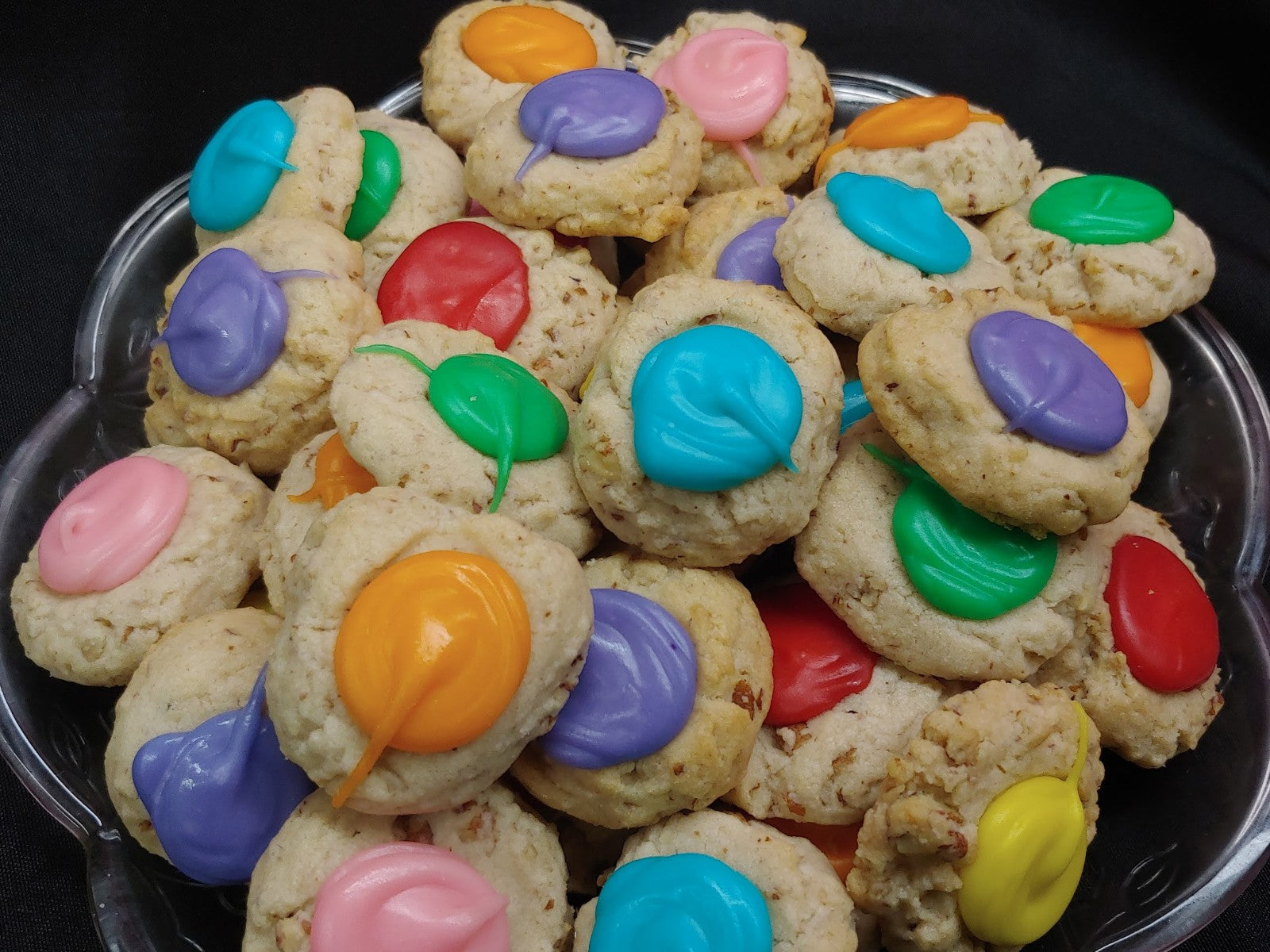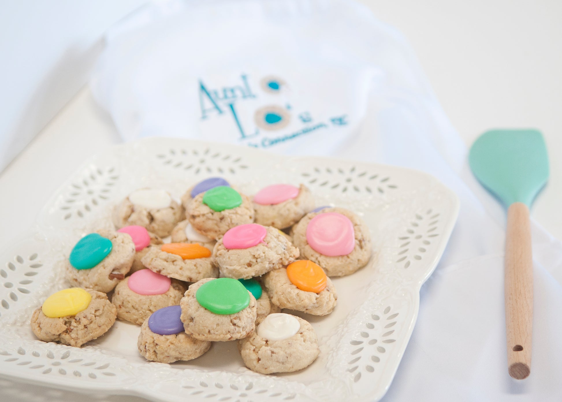 LoLo Dots- Our original LoLo Dots, buttery pecan thumbprint cookies with colorful icing dots. In a resealable bag of 1 dozen. LoLo Dots' colors change with the season. If you'd like a custom order, please email Loren at auntloscookie@gmail.com